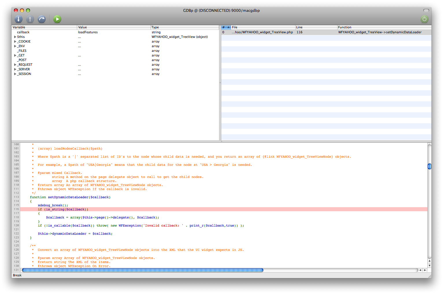 - The code will stop at an xdebug_break(), but not at a "breakpoint" set in the gutter of MacGDBP.