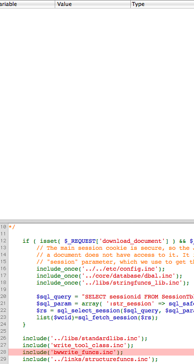 After stepping over the include here http://skitch.com/sven/bxhm6/gdbp-disconnected-9000-sven-2, the variable list goes empty. And stepping some more crashes the program.