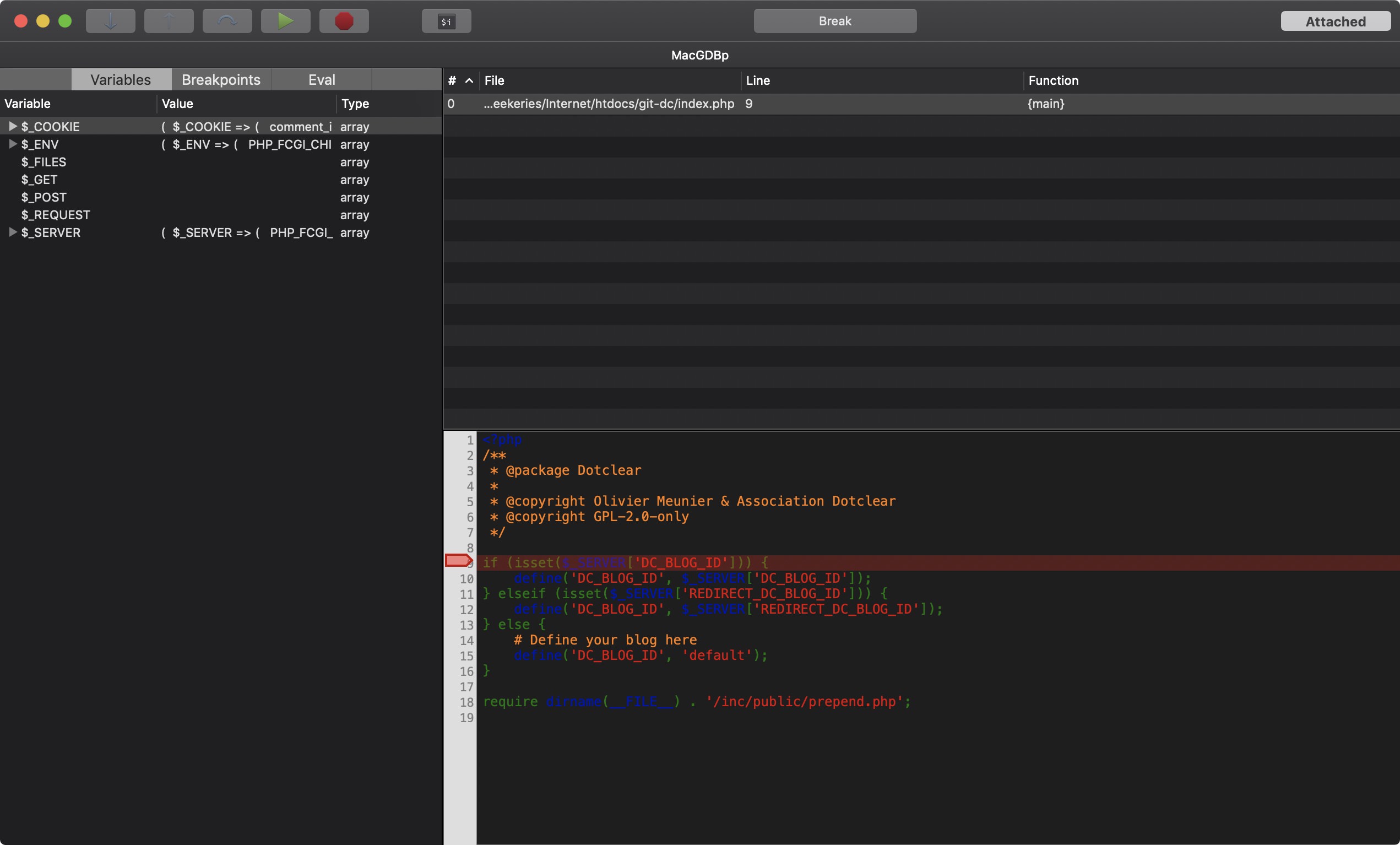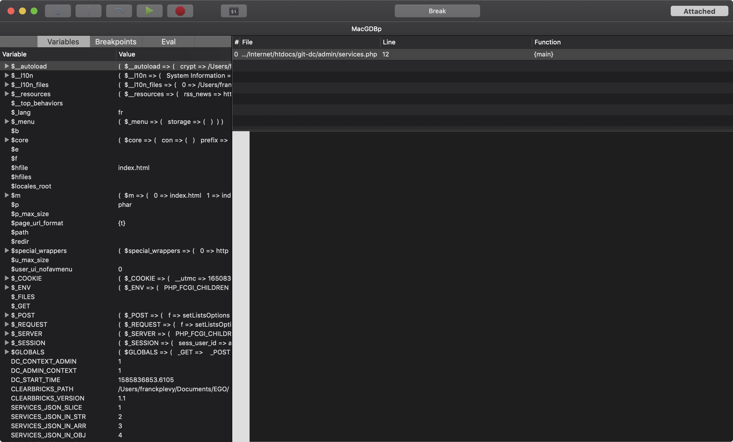 I have set https://admin.dc2-git.local/ as Remote, then …/htdocs/git-dc/admin/ as local (it's the root folder served by Apache for this domain), but still source code is not displayed. Only the current path and filename, the line and some variables. Very weird behaviour.