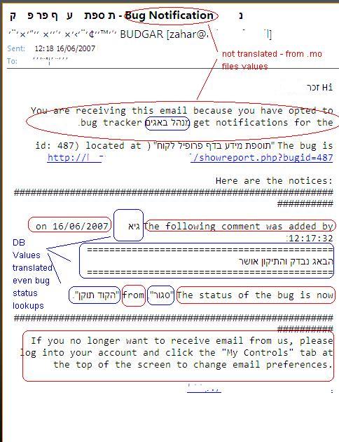 Email that sent by the system to notify of bug changes are not translated. I made translation to email's but for some reason i keep recive them on English except comments and fields values.